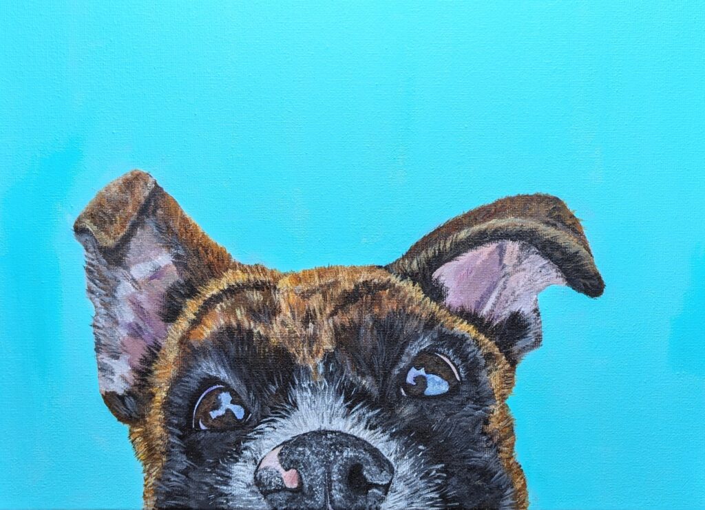 A Peek-a-boo pet portrait is an adorable way to capture your pet. Painted with a solid colour background of your choice. Your pet will peeking from the nose up.